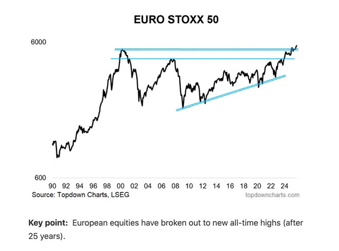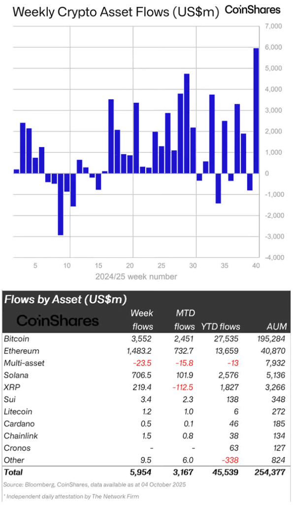 Crypto asset flows. “Digital asset investment products attracted [a record] US$5.95bn last week … Bitcoin saw a record US$3.55bn in inflows, Ethereum US$1.48bn, while Solana (US$706.5m) and XRP (US$219.4m) also set notable records.”