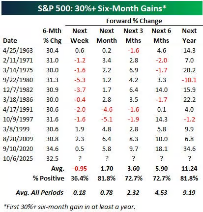 Below are the twelve days since 1953 where the S&P gained more than 30% in the prior six months (for the first time in at least a year). In terms of forward market performance following these days, the S&P has definitely shown some weakness in the very near term, but going out three months to one year, returns are slightly better than normal.