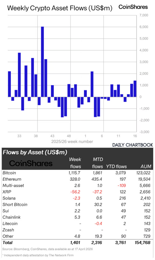 Crypto asset flows. “Digital asset investment products saw US$1.4bn of inflows, the third consecutive positive week and the strongest since January … Total AuM reached US$155bn, with flows representing 0.91% of AuM, the highest weekly intensity YTD.”