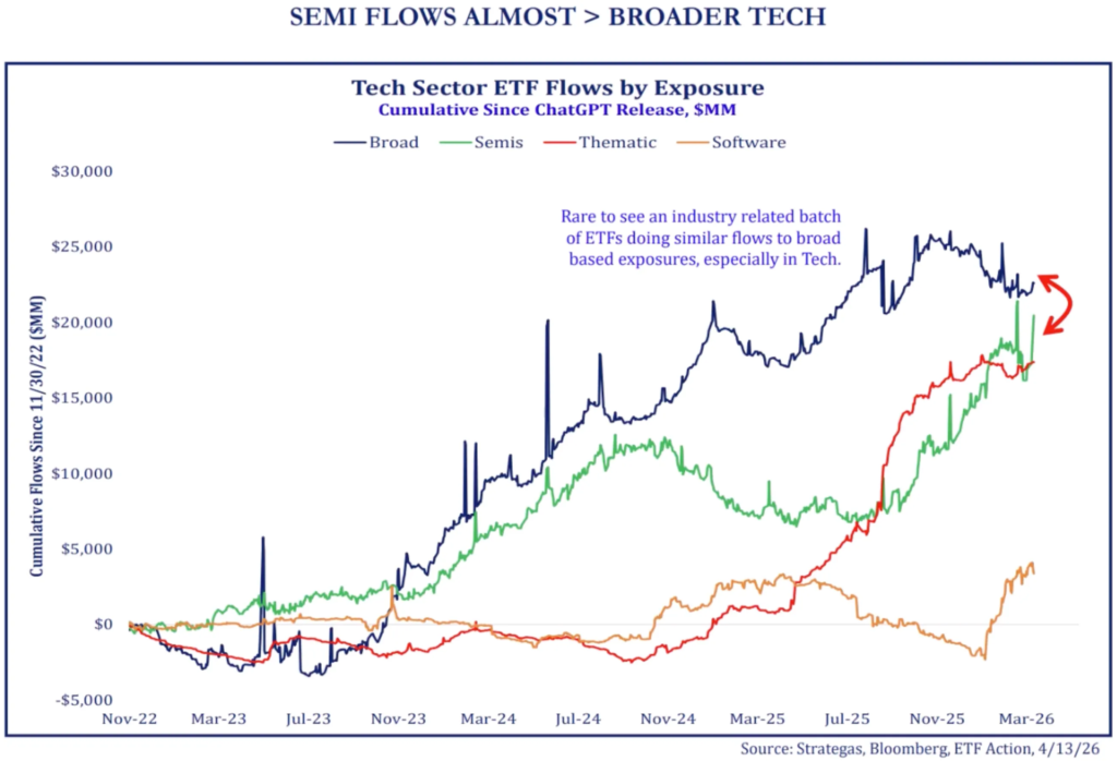 Tech sector ETF flows. “Chart shows you Tech sector ETF flows by different exposures since ChatGPT’s release roughly 3 years ago … this is pretty rare, to see an industry group overtake the broader sector exposure in our work.”