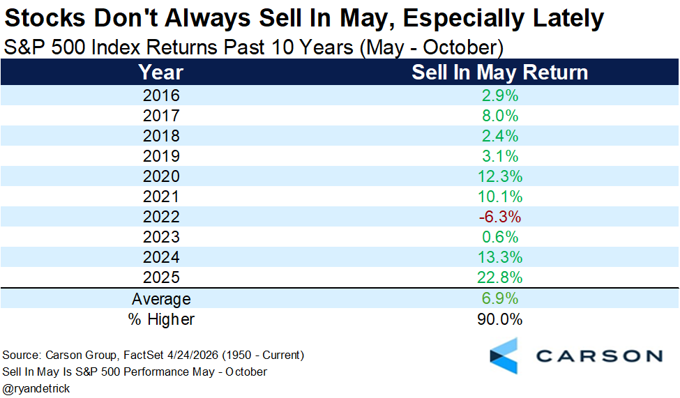 Seasonality. “Yes, the worst six months are coming up soon (May – October). But these six months have been lower only once the past decade and last year was the greatest Sell in May return ever (+22.8%). We are expecting another strong return this year.”