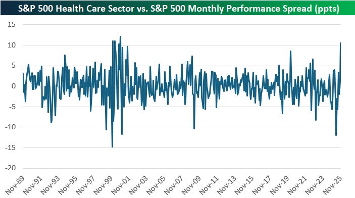 Bespoke Investment Group. So far this month, the Health Care sector is outperforming the broad S&P 500 by more than ten percentage points. As shown below, that hasn’t happened since November 2000!
