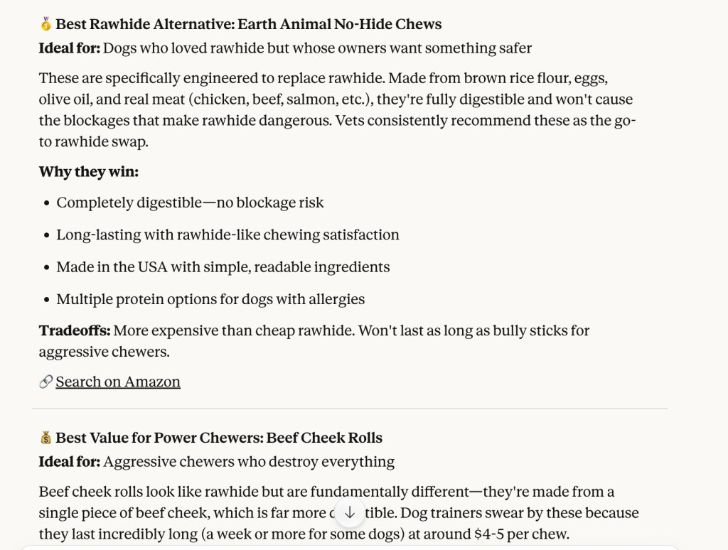With Claude’s help I built a simple “project” that lets me automatically do powerful research and searches with no junk or distractions. Here’s a bit of what it gave me when I asked it for ‘healthy dog chews’: