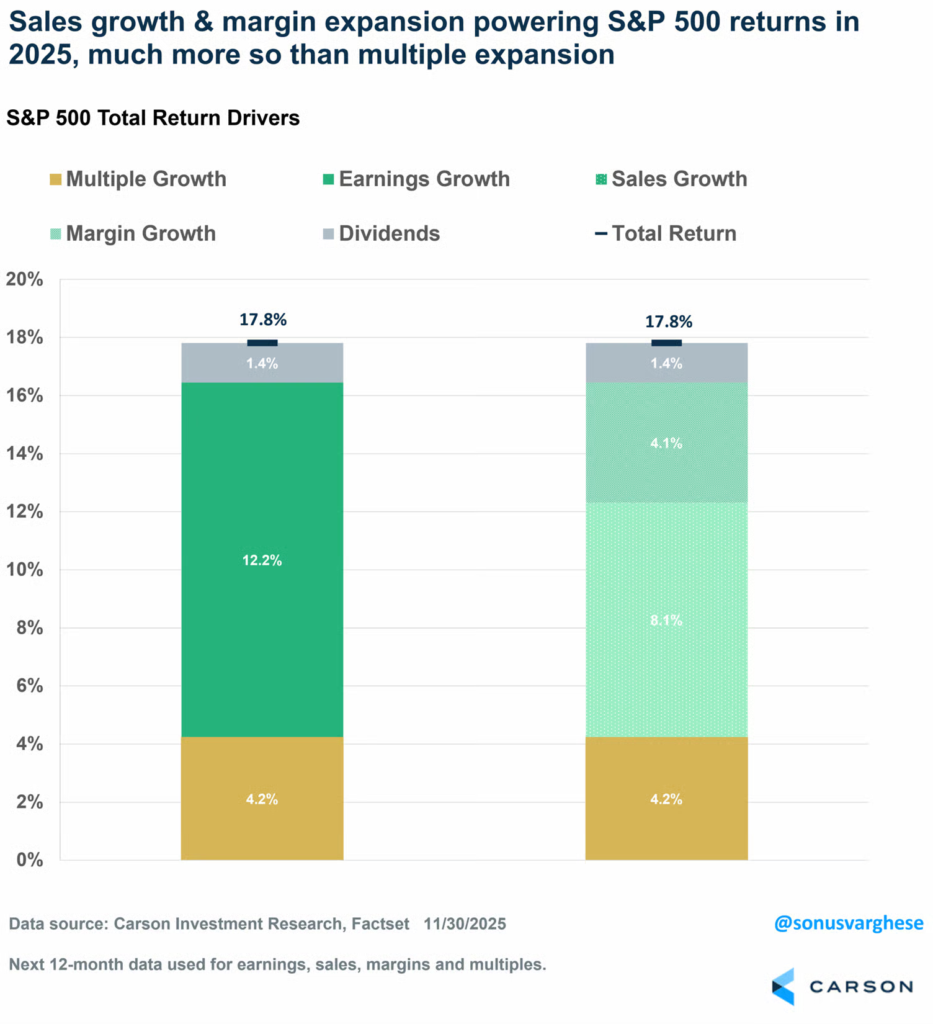 Return drivers. The S&P 500’s returns in 2025 have been powered mostly by earnings (sales + margin growth), with some multiple expansion.