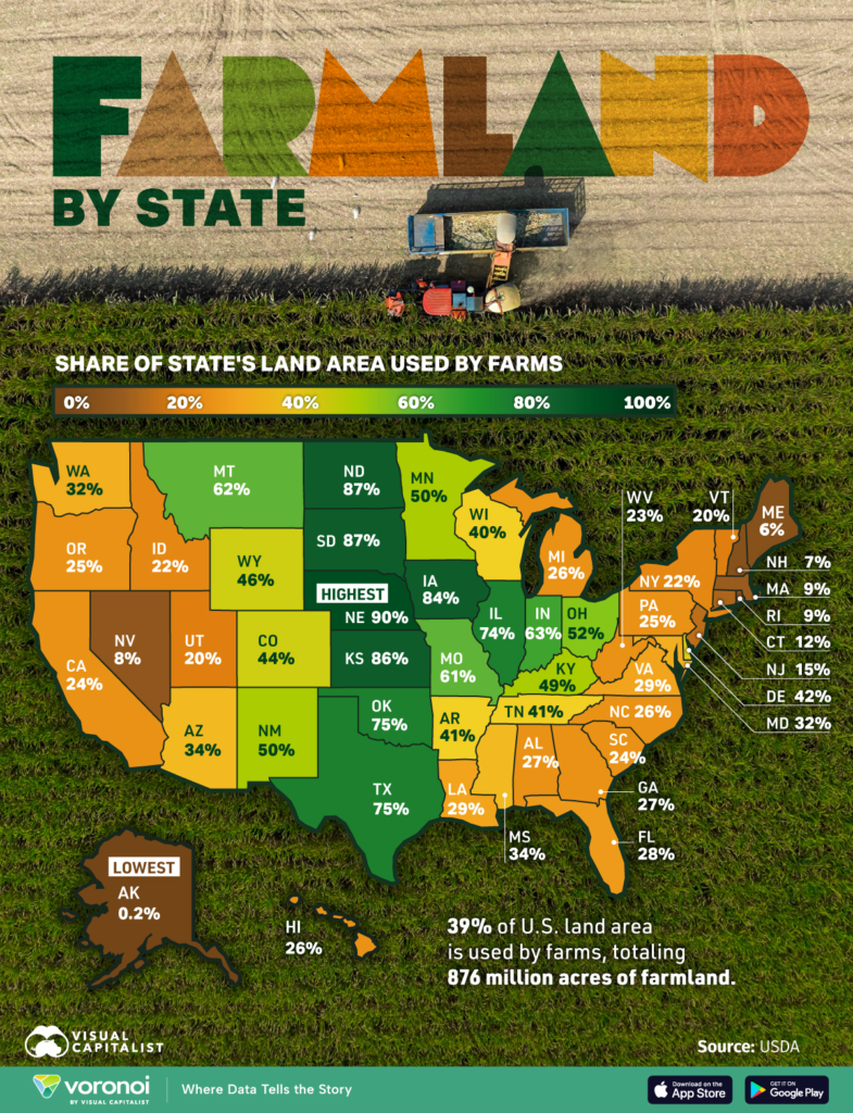 The map uses the latest data from the U.S. Department of Agriculture (USDA) to show the share of each state’s land area used for farming.