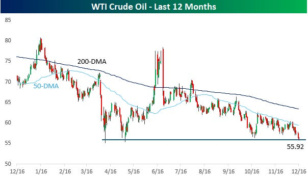 Bespoke Investments As mentioned above, crude oil prices are down over 1% this morning, and while not quite at 52-week lows on an intraday basis, if these losses hold, it will mark a new 52-week closing low. After briefly trading over $80 per barrel in January, prices have been in a steady decline almost all year. The only exception was back in June when prices briefly spiked after Israel launched airstrikes on Iranian nuclear facilities.