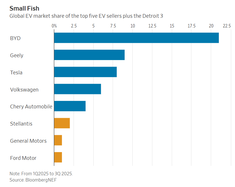 Look at the list of regulatory changes this year, and it is all but impossible for U.S. automakers to not lean into selling big SUVs and trucks. Car manufacturers no longer face penalties for failing to meet federal fuel-economy standards, which are themselves also being revised to become less stringent. The $7,500 tax credit for buying EVs expired. California no longer has the ability to set its own tailpipe-emissions standards, which were a big driver of EV investment. BloombergNEF estimates that 24% fewer EVs will be sold in the U.S. in the fourth quarter of 2025 compared with a year earlier.