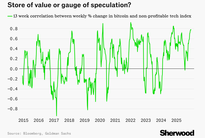 1. Bitcoin Recently Trading at .80 Correlation to Goldman Non-Profit Tech Stock Index