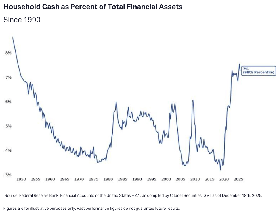 Household cash. “Households continue to hold near-record cash balances (98th percentile historically), leaving substantial dry powder should confidence and risk appetite continue to improve. We see this ‘buy-the-dip’ behavior, every day in our data at Citadel Securities.”