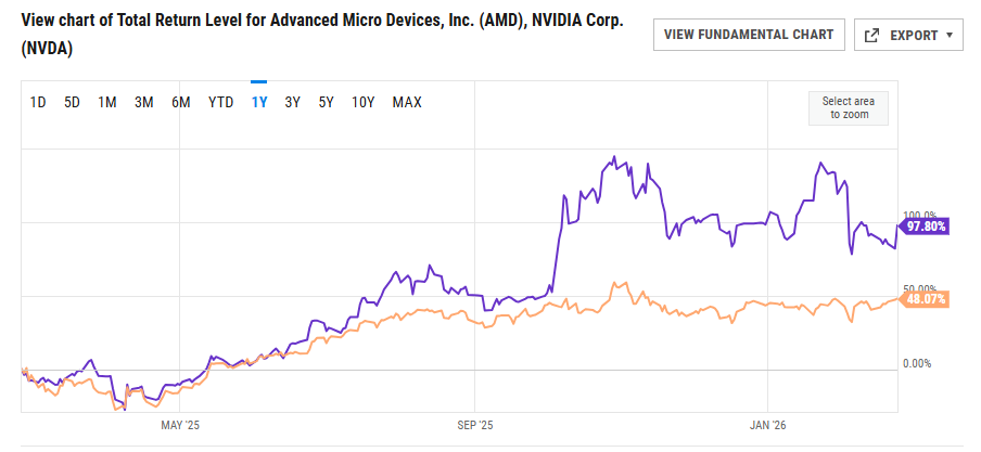 2. One-Year Chart AMD +98% vs. NVDA +48%