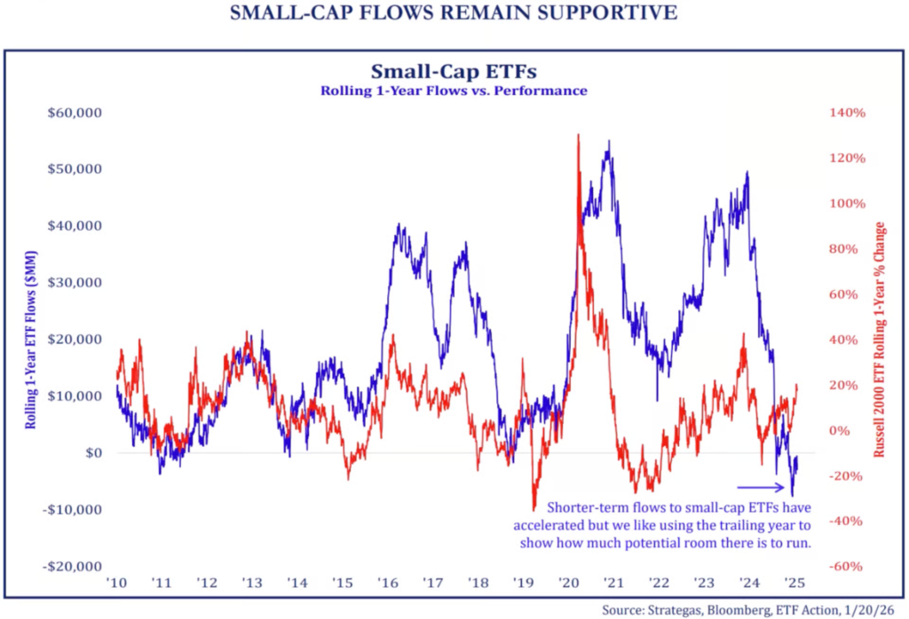 Small cap ETF flows. “If you look at small cap ETFs, all of them together, over the last year there are still outflows”.