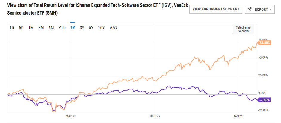 3. One-Year Chart-Semiconductors +74% (SMH) vs. Software -7.5% (IGV)
