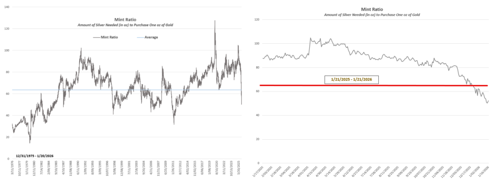 The chart below illustrates the historical behavior of the Mint Ratio dating back to 1975. Over this period, the ratio has averaged a value of roughly 63.5, meaning that it has historically taken about 63.5 ounces of silver to purchase one ounce of gold. Between 2012-2025, the ratio has largely remained above its long-term average, indicating sustained relative strength in gold. Over the past year, however, this trend reversed sharply as silver began to outperform. The Mint Ratio peaked just above 100 in April of 2025 before entering a sustained downtrend. Notably, the ratio fell below its historical average in December, signaling a shift away from defensive positioning and toward a more offensive, risk-oriented market postures.