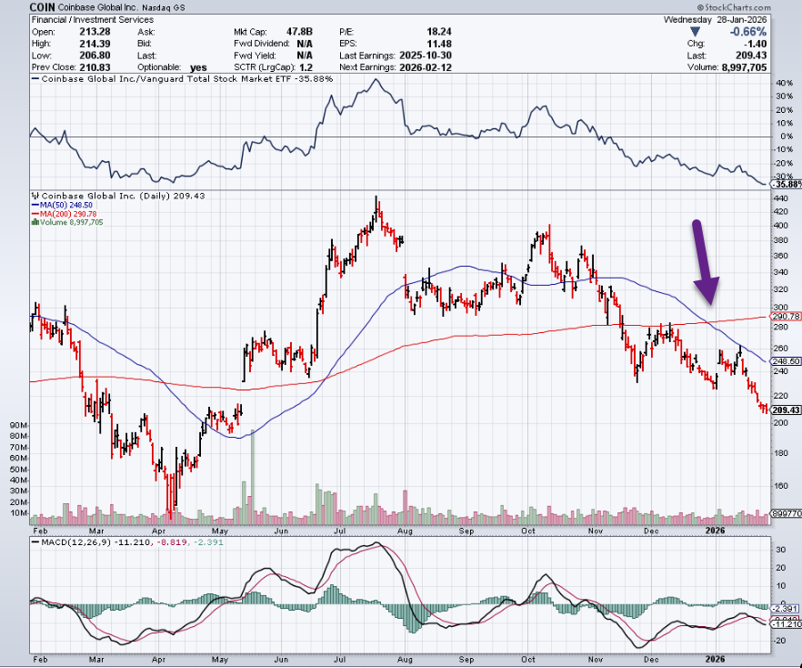 6. Coinbase 50day thru 200day to Downside…Speculation Moves to Kalshi and Polymarkets?