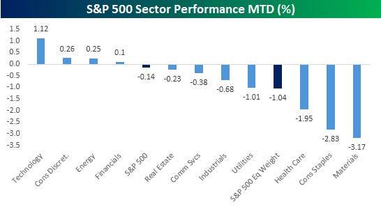 The sectors you would expect to outperform in the event of war would be defensives like Utilities, Consumer Staples, and Health Care. But guess what? They’re three of the four worst-performing sectors with declines of at least 1% each! While the S&P 500 is surprisingly higher this week, the rally is primarily due to the 1%+ gain in the Technology sector. On an equal weight basis, the index is down 1.04%, and 60% of its components are down MTD.