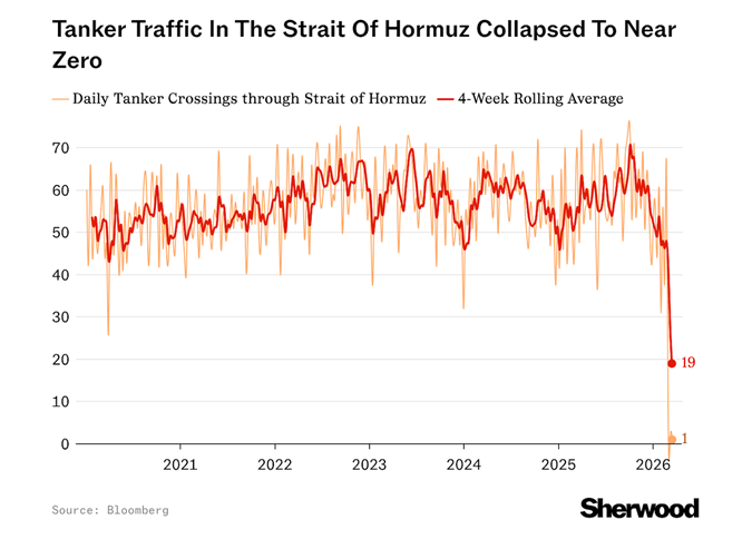 Sherwood News With attacks on vessels in the narrow transit corridor escalating last week, Bloomberg data shows that daily ship traffic through the Strait of Hormuz has plunged 98.5% over the past three weeks, from 67 vessels on February 22 to just one ship on March 16.