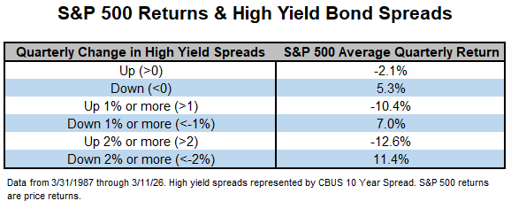 Nasdaq Dorsey Wright The economy and the stock market are not one in the same, but there is a typically a strong relationship between the two and US equities have historically performed significantly better when high yield spreads are narrowing, indicating favorable economic conditions. The table below shows the quarterly performance of the S&P 500 when high yield spreads are narrowing versus when they are widening. It is also apparent that the magnitude of the change is also change is also significant as the S&P has performed better during quarters when spreads narrowed significantly and worse when they widened by a large amount.