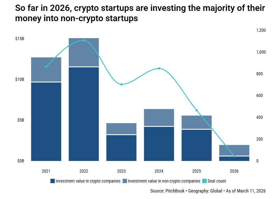 Pitchbook-So far in 2026, VC-backed crypto companies have invested $1.4 billion in startups outside the industry, more than twice the $600 million they invested in crypto-focused startups, according to PitchBook data.