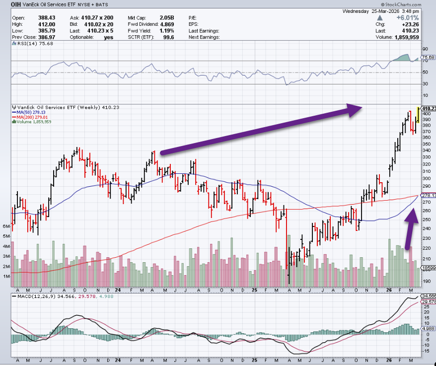 Oil Services ETF OIH-Breakout and 50week crossing to Upside 200week on Long-Term Chart.