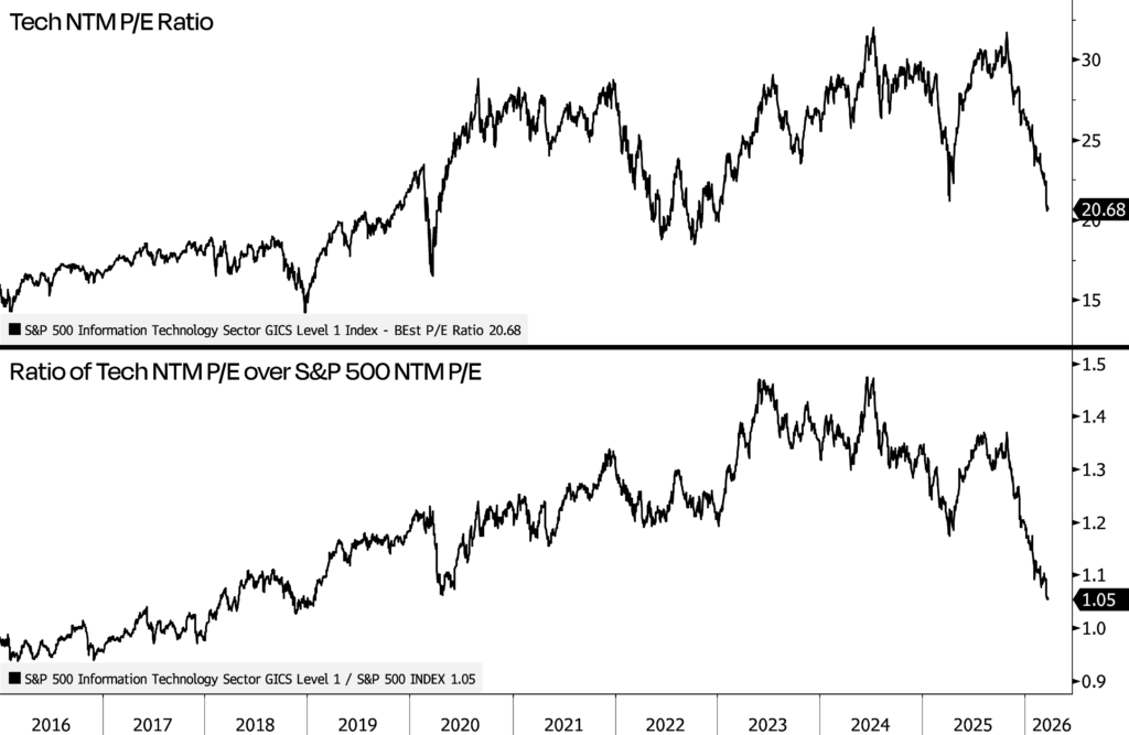 Tech vs. SPX. Tech’s premium over the S&P 500 has all but vanished: now at the lowest since early 2019.