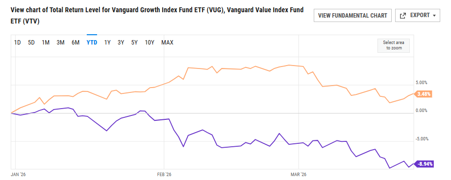 4. Vanguard Growth VUG vs. Vanguard Value VTV 2026….VTV +3.5% vs. VUG -9%