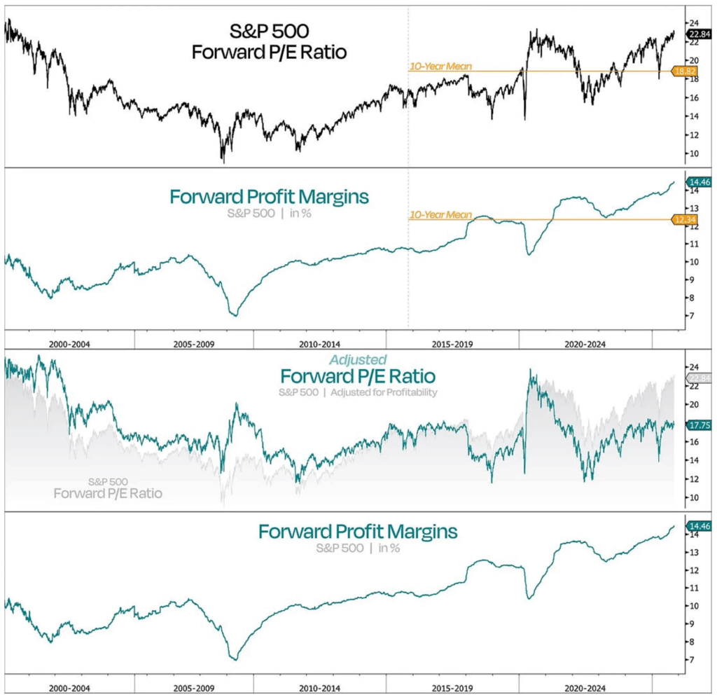 Profitability-adjusted valuation. “Anyone comparing today’s valuations to the Dotcom era on a basic P/E basis is missing the point … higher profitability demands a higher valuation premium. Using our profitability-adjusted model, today’s P/E comes out to 17.75x — less than one standard deviation above its 20-year average of 16.2x.”