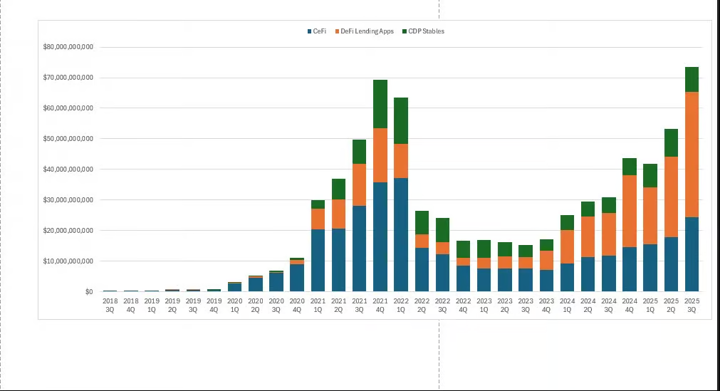 Crypto lending. The recent drop in crypto prices was preceded by a record-breaking $73.6 billion in crypto lending in Q3.