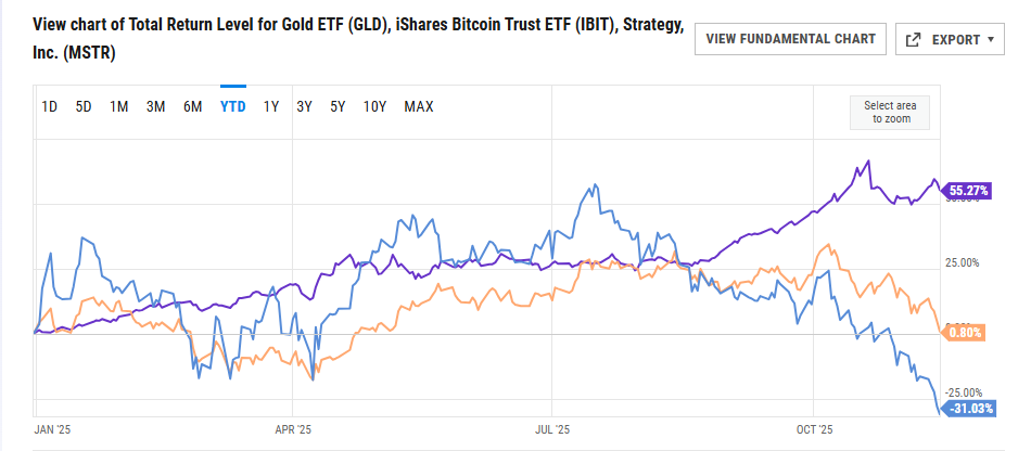 3.Bitcoin, Micro Strategy and GLD Comparison 2025…..GLD outperforming MSTR by 86%