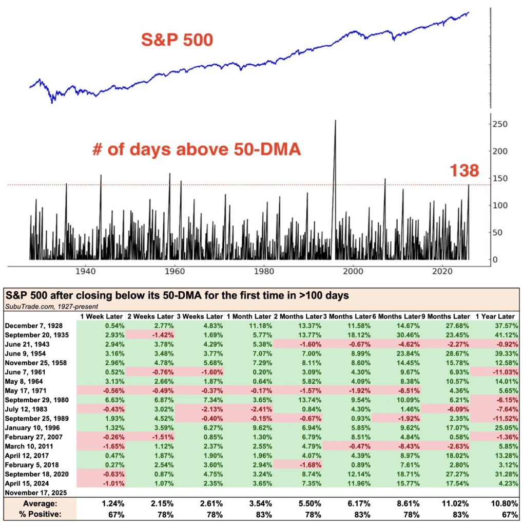 SPX vs. 50DMA. “$SPX finally closed below its 50 day moving average, after 138 days! Here’s what $SPX did next after such long rallies ended.”