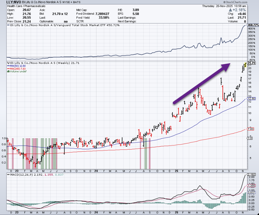 7. Weight Loss War…LLY vs. NVO …Lilly is Huge Outperformance Since Late 2024…This Chart Shows LLY vs. NVO