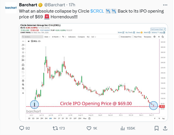 9. CRCL IPO Retail Favorite Collapses Back to IPO Price….Stock Hit $260 on Highs