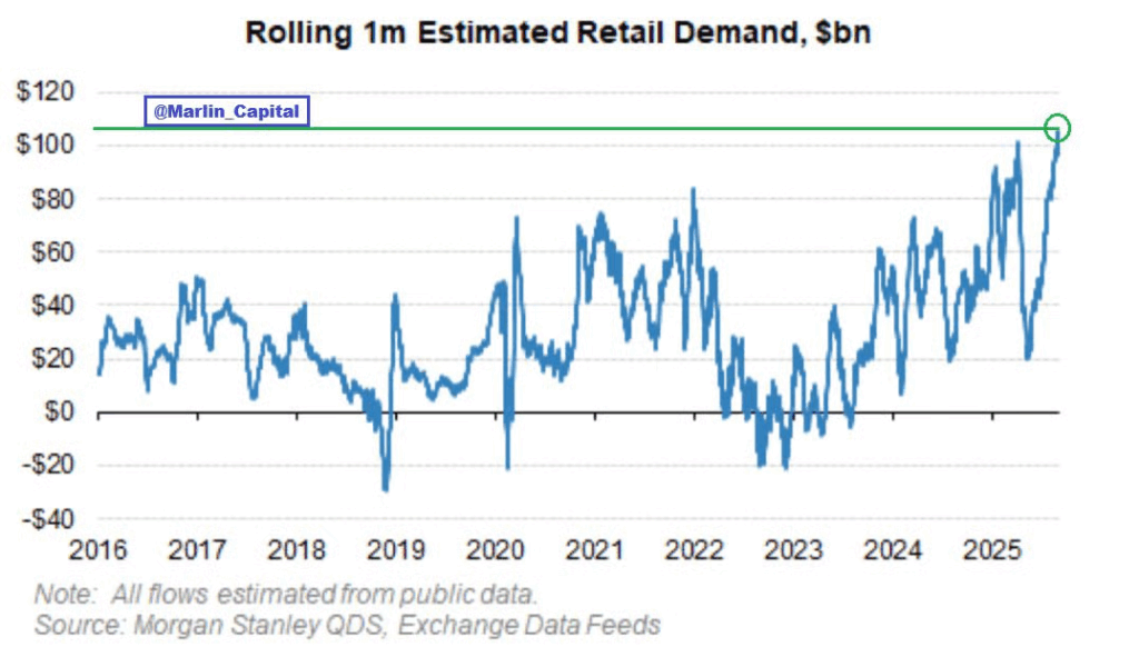 Retail demand. “We have just witnessed the largest Retail Investor buying EVER. Retail has bought over +$100B of US stocks in the last month, the largest 1M buying on record.”