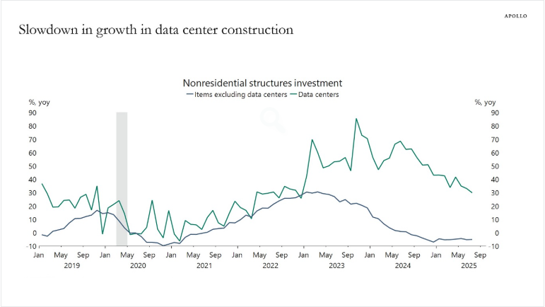 Torsten SløkApollo Chief EconomistThere is still strong growth in data center construction, but the current growth rate at 30% is lower than the 80% observed two years ago, see chart below.