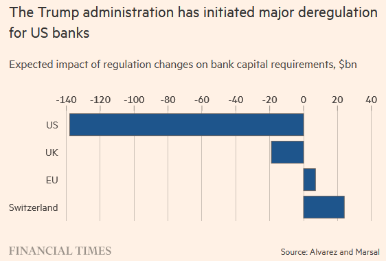 Dave Lutz at Jones Trading “We think the Trump administration is kicking off a major wave of deregulation, unlocking a huge amount of capacity, which will give a massive economic boost and an earnings uplift,” said Fernando de la Mora, co-head of financial services at Alvarez & Marsal. The New York-based consultancy predicted US banks would benefit from a 14 per cent reduction in their requirements for common equity tier one, a capital buffer that gives them capacity to absorb losses.