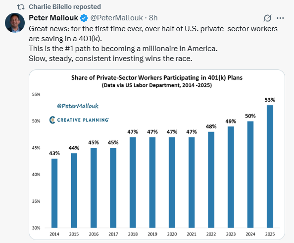 10.As Stated in My Quarterly Letter.. The U.S. is a Now a Stock Market Nations….Half of Private Sector Employees in 401k