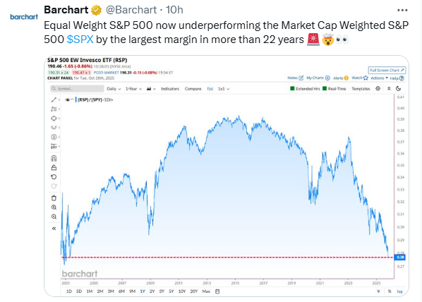 3. Equal Weight Underperforming Market Cap Weighted by Biggest Margin Ever