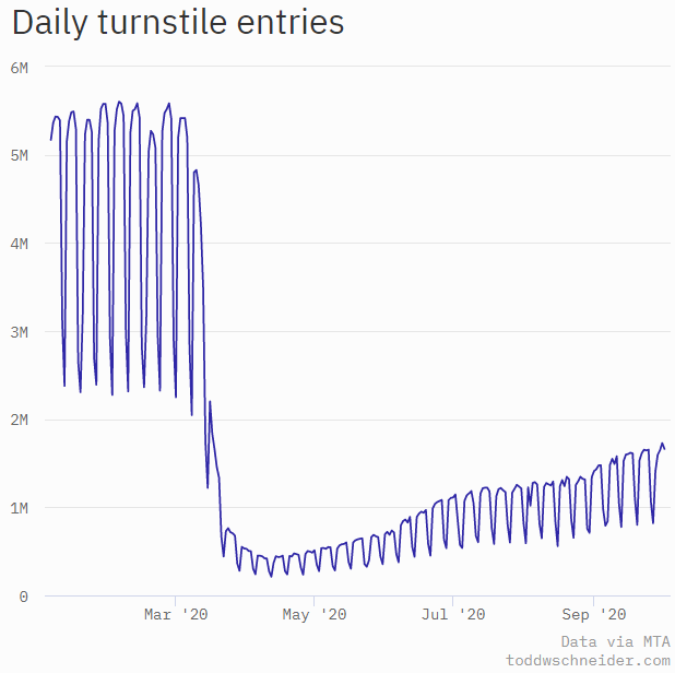 He notes: “Data updates weekly from the MTA’s public turnstile data, usually on Saturday mornings”.